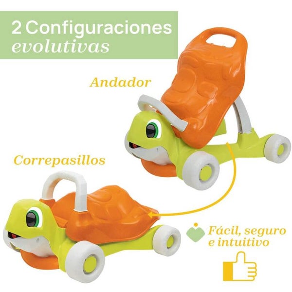 - CORREPASILLOS A PARTIR DE 1 AÑO: Bajando el caparazón de la tortuga, podrás transformar el andador en un correpasillos para que los niños y niñas puedan impulsarse utilizando sus piernas para desplazarse libremente por la casa.